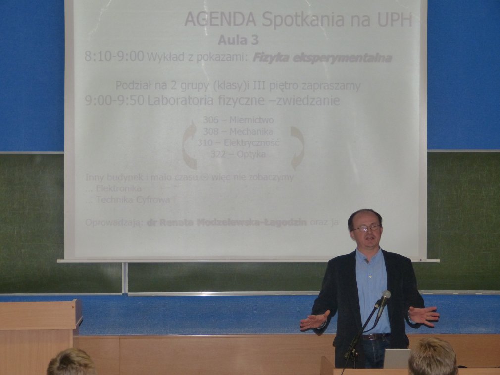 Spotkanie rozpoczęto w Auli 3 od wykładu z pokazami pt. Fizyka eksperymentalna, które poprowadził dr Marek Siłuszyk. Młodzież aktywnie brała udział w eksperymentach wspomaganych komputerowo. Podczas eksperymentów analizowano różne rodzaje ruchów, badano temperaturę, dźwięk czy też oświetlenie. Olbrzymim powodzeniem cieszyły się również doświadczenia wirtualne. Następnie młodzież została oprowadzona po naszych laboratoriach fizycznych, tj. optyka, elektryczność, ciepło, mechanika oraz miernictwo, gdzie mogła „dotknąć” sprzęt laboratoryjny i zobaczyć jak wykonuje się eksperymenty. Po pracowniach laboratoriach oprowadzali pracownicy Katedry Fizyki tj. dr hab. Krzysztof Iskra, dr Renata Modzelewska-Łagodzin oraz dr Marek Siłuszyk. Zachwycona młodzież oraz kadra nauczycielska w podsumowaniu spotkania mówią po prostu chcemy więcej.