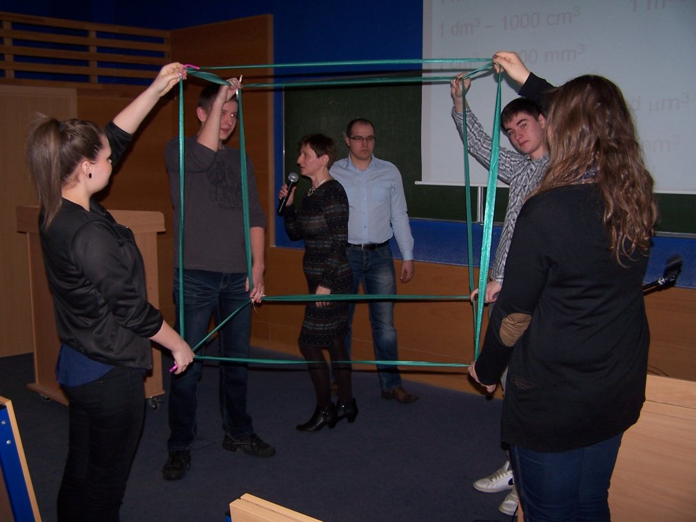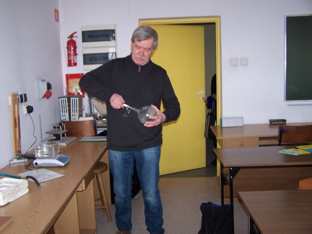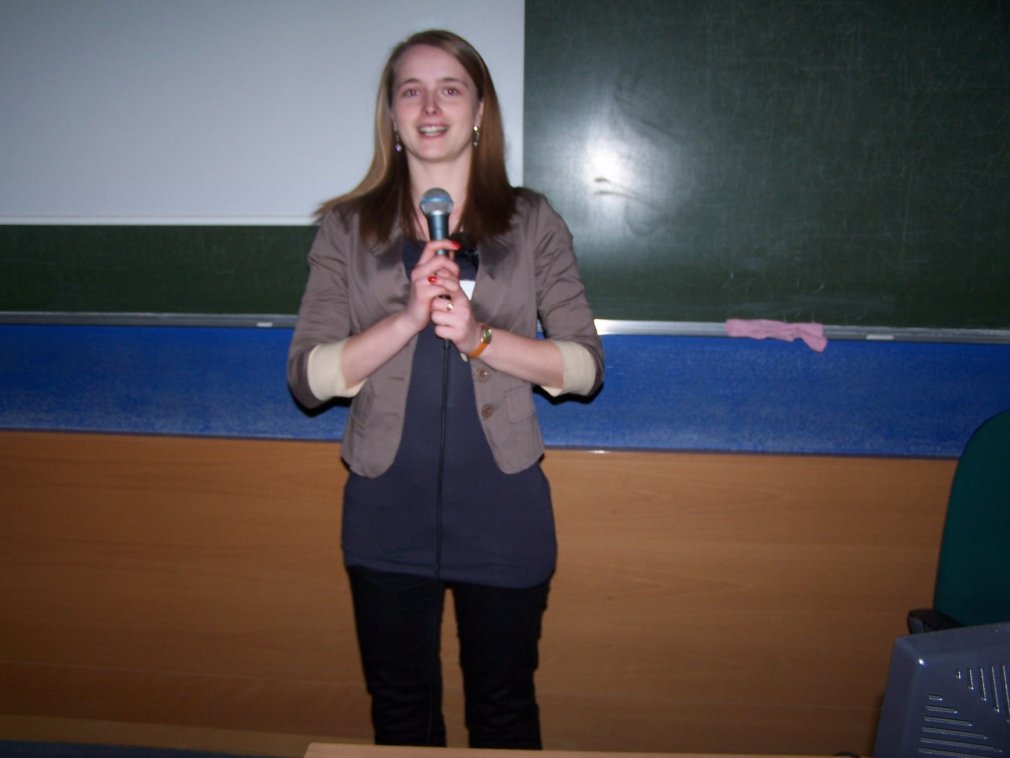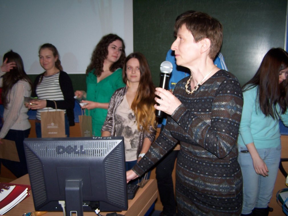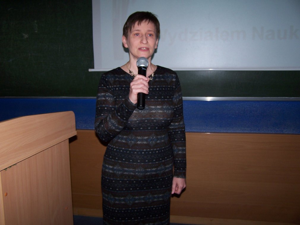 Pierwszy z wykładów pt. "Raz, dwa, trzy, ... MOL!" wygłosiła Pani dr Barbara Pezler z Instytutu Chemii. Wykład poświęcony był WIELKIM liczbom, czyli uniwersalnym stałym fizycznym, którymi Nauki Ścisłe posługują się, opisując i wyjaśniając rzeczywistość, której doświadczamy. W czasie wykładu można było przekonać się, jak duży jest mol, jak mały jest atom, czy kwanty są użyteczne, jak tuneluje elektron i czy Nagrodę Nobla z chemii może zdobyć matematyk do spółki z fizykiem. Najbardziej aktywni (fizycznie) uczestnicy spotkania zostali obdarowani jednomolowymi porcjami pierwiastków i związków chemicznych.