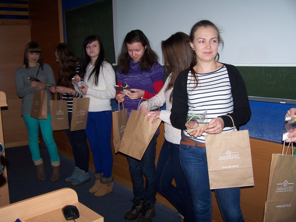 Z uwagi na tak liczne przybyłą grupę spotkanie przebiegało w II turach. W każdej z nich odwiedzający nas uczniowie wysłuchali krótkiego, interdyscyplinarnego wykładu z zakresu nauk ścisłych, spotkali się ze studentami, przedstawicielami kierunków Wydziału, wzięli czynny udział w ciekawych i pouczających pokazach doświadczeń w pracowniach instytutów: Chemii, Matematyki i Fizyki oraz Informatyki. Na pamiątkę udziału w „wagarach” wszystkie uczestniczące klasy otrzymały „certyfikaty wagarowicza” sygnowane przez Panią Dziekan.