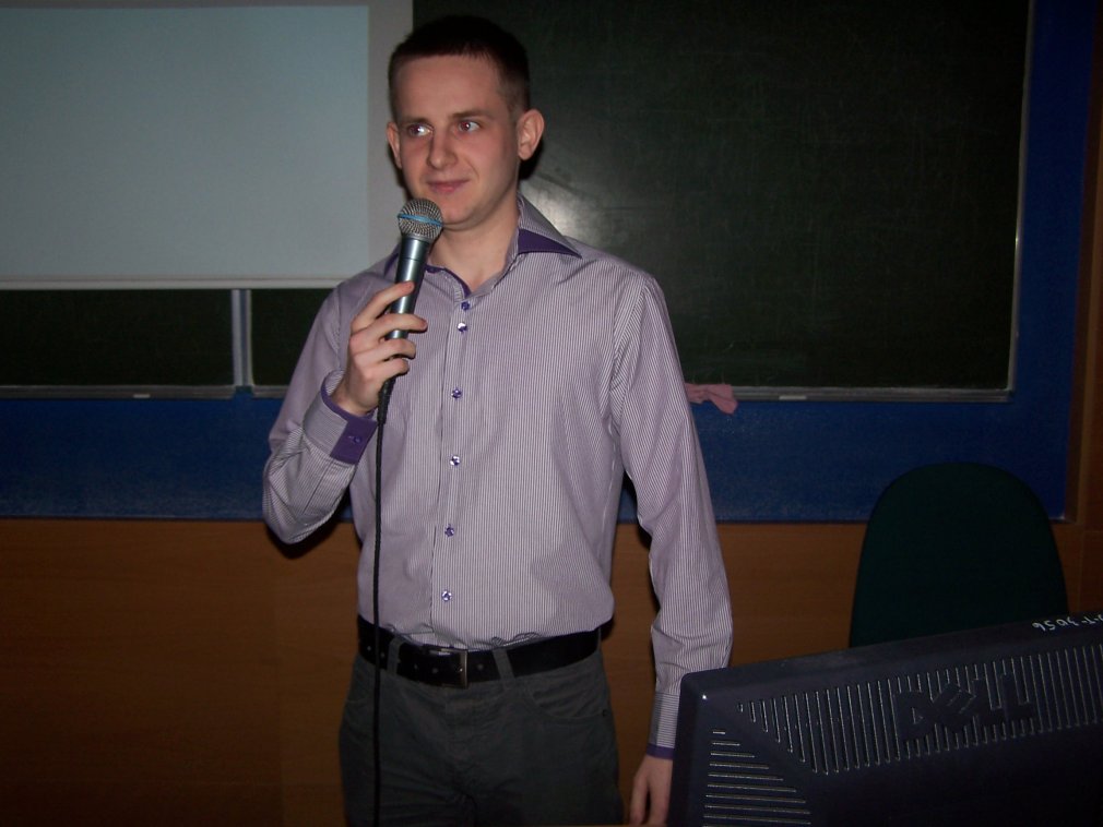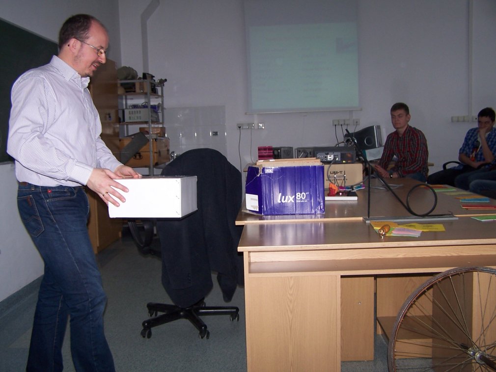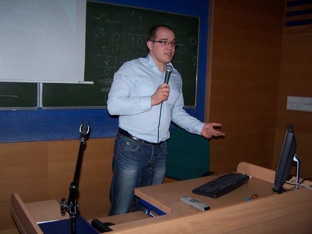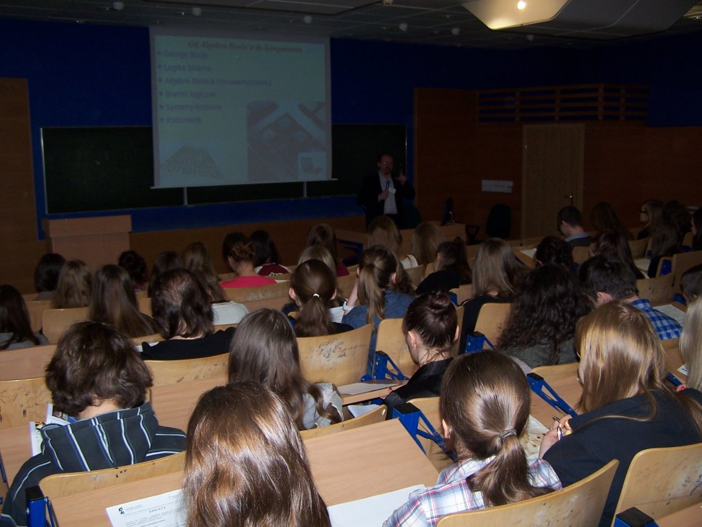 Drugi wykład pt. "Od Algebry Boole’a do komputerów” wygłosił Pan dr Marek Siłuszyk z Instytutu Matematyki i Fizyki. Wykład miał na celu pokazanie uczniom, że zbiór dwuwartościowy złożony z {0, 1} jest podstawą całej obecnej INFORMATYKI. Nic nie jesteśmy w stanie zrobić bez znajomości systemu binarnego (dwójkowego), który nie tylko jest systemem liczbowym, ale pełni funkcję alfabetu stosowanego przez komputery do cyfrowego opisu i odwzorowania rzeczywistości. Głównym osiągnięciem Georgia Boole’a było wprowadzenie do matematyki i logiki pojęcia algebry dwuwartościowej zwanej później od nazwiska twórcy algebrą Boole'a. Ze względu na wagę tego pojęcia oraz jego zastosowań w informatyce i matematyce, a dokładniej w logice matematycznej autor jest uważany za jednego z twórców tych dziedzin nauki. Na wykładzie pokazano, że pewne określenia, o których mówi się na Matematyce, Fizyce i Informatyce są wspólne, czasami język/terminologia jest specjalistyczna ale treść jest niezmienna. Ten fakt łączenia przedmiotów ścisłych jest bardzo ciekawy i niezbędny w procesie edukacji.
