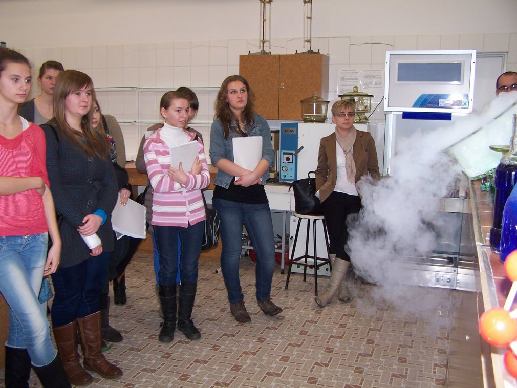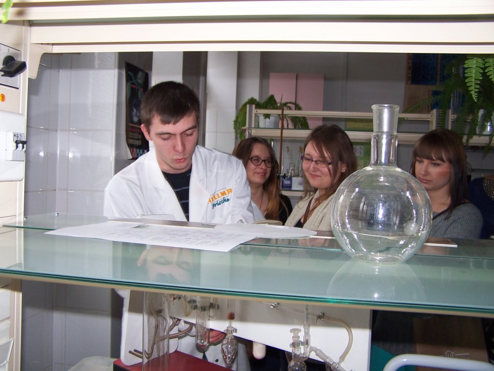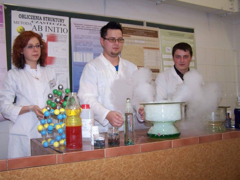 Mrożone tulipany, uwalnianie dżina z butelki, srebrne probówki, a przede wszystkim słodkie i kolorowe tablice Mendelejewa – w tak różnorodny sposób studenci kierunku chemia prezentowali kierunek przed swoimi nieco młodszymi kolegami – kandydatami na studia. Uczniowie szkół ponadgimnazjalnych mogli zobaczyć warunki studiowania, poznać laboratoria Instytutu Chemii a przede wszystkim spotkać się ze studentami, posłuchać bezcennych rad oraz zaczerpnąć informacji o studiach. Studenci z wielką pasją prezentowali specjalnie dla nich przygotowane pokazy atrakcyjnych doświadczeń chemicznych. W dwóch laboratoriach ICh można było zobaczyć i dowiedzieć się, jak otrzymać zielony płomień, ciekłą lampę, jak uwolnić dżina z butelki, jak posrebrzyć powierzchnię szkła a nawet samodzielnie otrzymać krem. Prezentowano również rozmaite zestawy urządzeń laboratoryjnych i szkła – zarówno do doświadczeń na dużą skalę jak i w skali mikro. Najbardziej aktywni uczniowie otrzymali pamiątkowe gadżety – notesy, ołówki oraz odtwarzacze mp3.