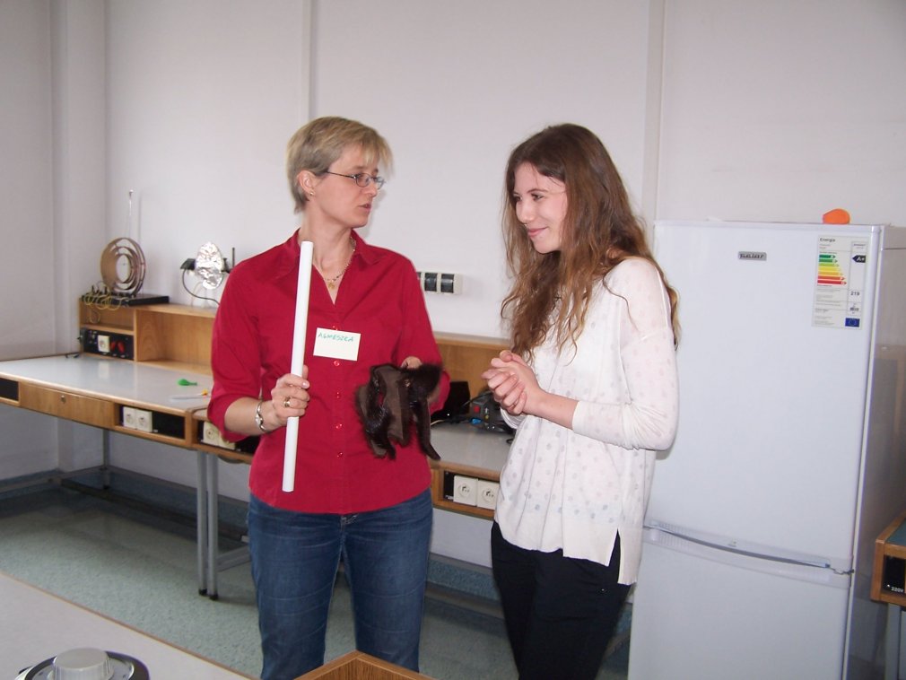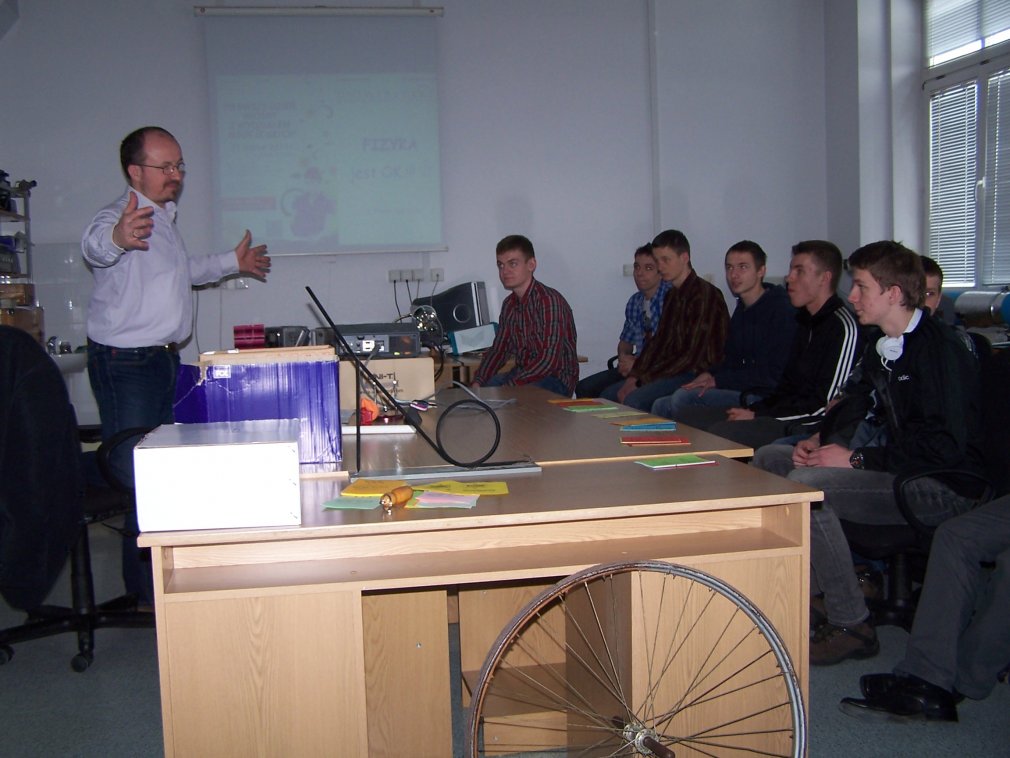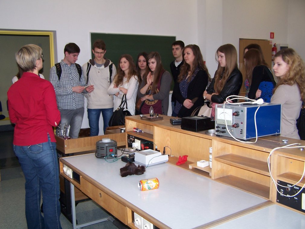 Zajęcia w pracowniach Fizyki prowadzili: prof. dr hab. Krzysztof Iskra, dr Agnieszka Gil-Świderska, dr Marek Siłuszyk oraz studenci matematyki, którzy pokazali Fizykę w „życiu codziennym”. Młodzież została oprowadzona po laboratoriach fizycznych, tj. optyka, elektryczność, ciepło, mechanika oraz miernictwo, gdzie mogła „dotknąć” sprzęt laboratoryjny i zobaczyć jak wykonuje się eksperymenty, poprzez które mogli zobaczyć jak ciekawa jest nauka o przyrodzie. Uczniowie chętnie samodzielnie przeprowadzali proste eksperymenty podczas, których analizowano różne rodzaje ruchów, badano temperaturę, dźwięk czy też oświetlenie. Ponadto aktywnie brali udział w eksperymentach wspomaganych komputerowo. Wielkim zainteresowaniem cieszyły się pokazy doświadczeń z zakresu elektromagnetyzmu, które prowadził Łukasz Cegiełka student II roku Matematyki.