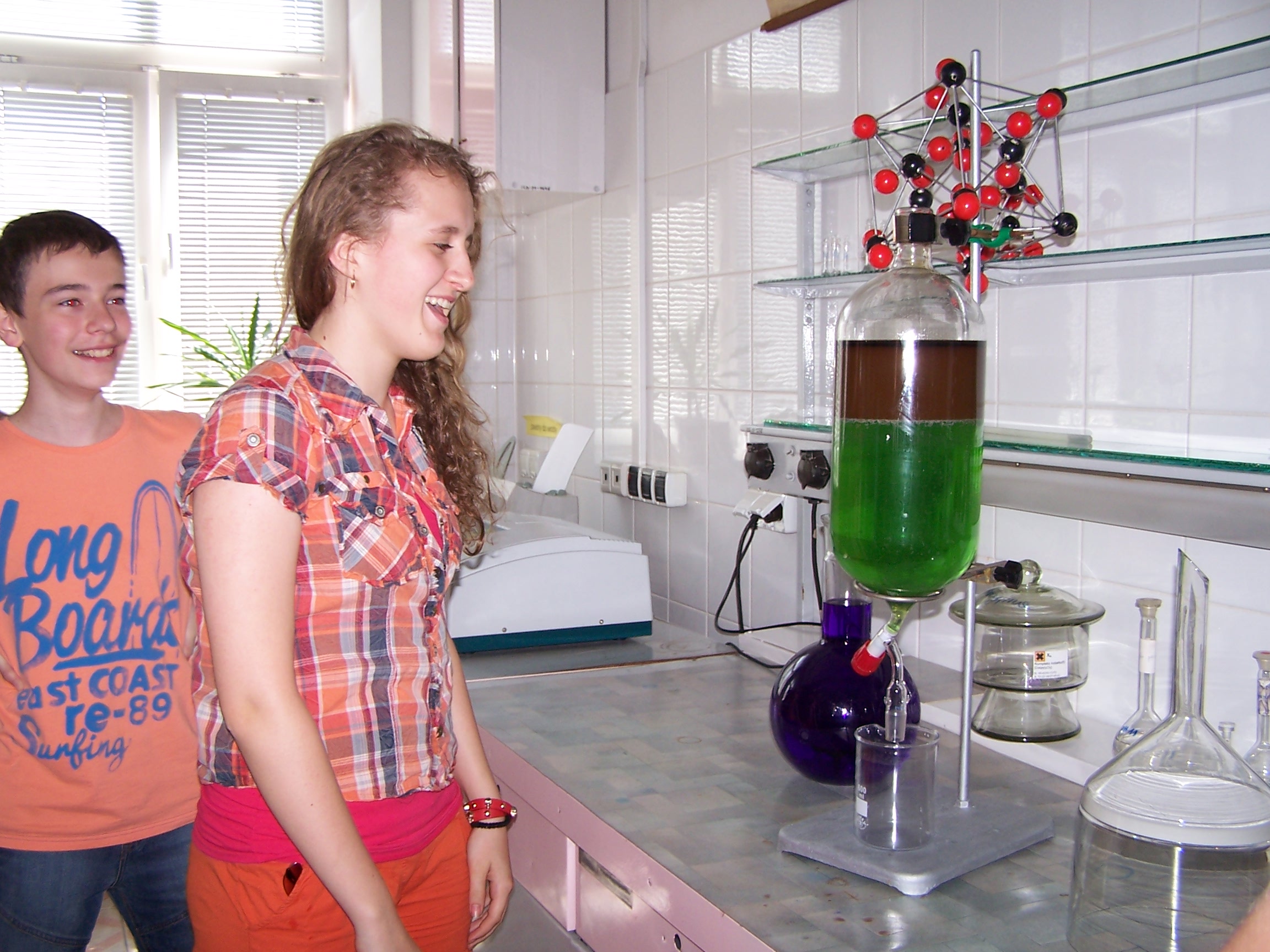 W piątek, 14 czerwca przyjęliśmy uczniów z ich opiekunami z wszystkich sześciu siedleckich gimnazjów. Uczniowie uczestniczyli w ćwiczeniach przygotowanych dla nich przez studentów z Koła Naukowego Chemików. W pracowni 105 widowiskowe ćwiczenia prezentowali studenci I roku studiów II stopnia: Aleksandra Borkowska, Piotr Oponowicz i Mikołaj Kresa oraz II roku studiów I stopnia: Marlena Szczepańska, Weronika Chodowiec i Monika Cieciera. W pracowni 108 doświadczenia prezentowały studentki II roku chemii: Karolina Wereszczyńska, Joanna Popławska i Karolina Prachnio. Młodzi goście bardzo dobrze się czuli w naszych laboratoriach, interesowali się w zasadzie wszystkim, chętnie zadawali liczne pytania. Sprawny przepływ uczestników między laboratoriami oraz przebieg pokazów dla tak licznej grupy gości zawdzięczamy studentowi II roku chemii Michałowi Soszyńskiemu, zaś całość koordynowała pani doktor Krystyna Wojciechowska.