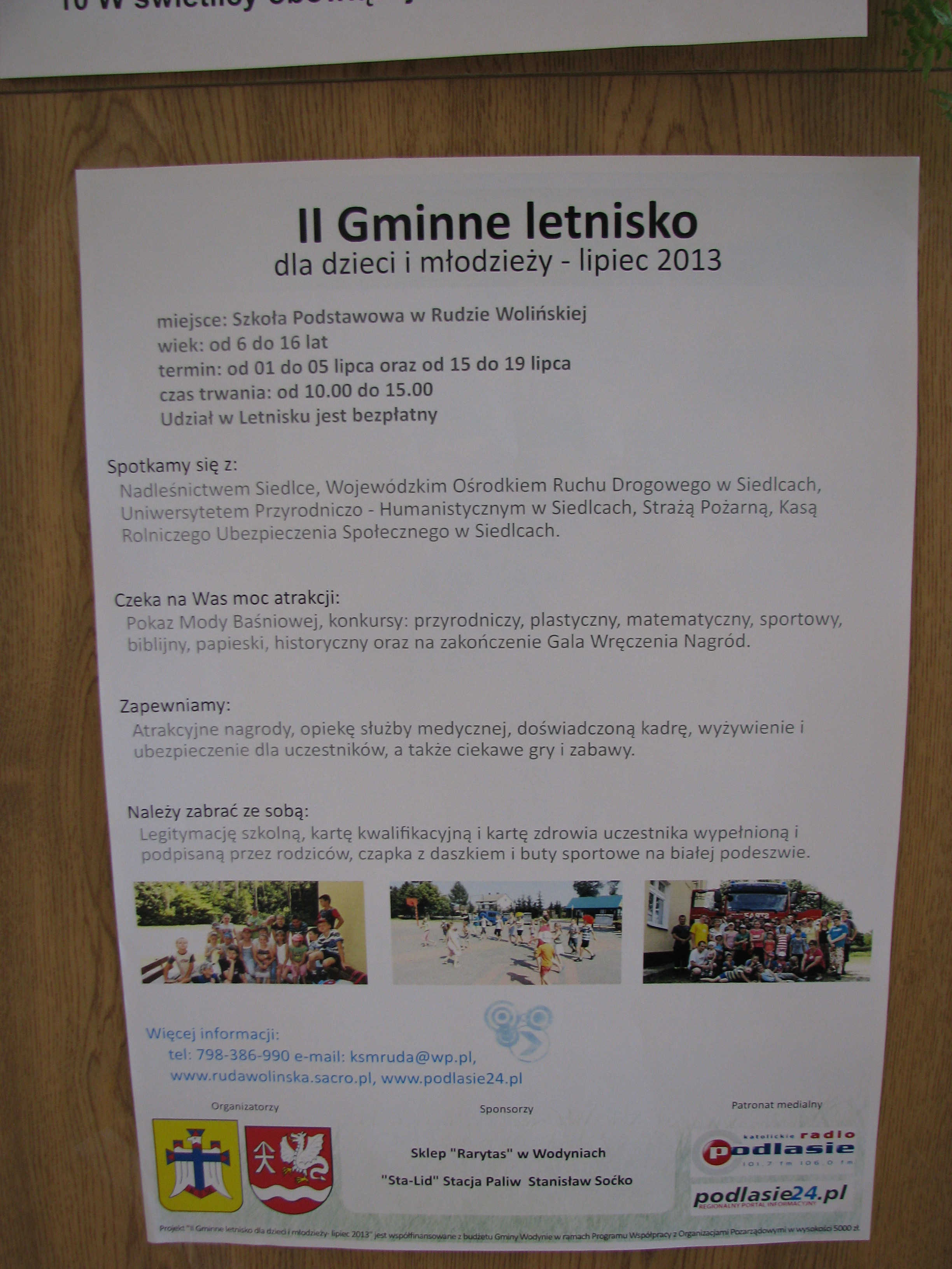 Na zaproszenie prezesa KSM z Rudy Wolińskiej, Pana Marcina Polaka, w dniu 1 lipca 2013 roku Koło Naukowe Studentów Matematyki w składzie Monika Kosiorek, Izabela Świderska oraz Beata Andrzejczuk wraz z opiekunem dr Agnieszką Prusińską przeprowadziło warsztaty matematyczne podczas II Gminnego Letniska.