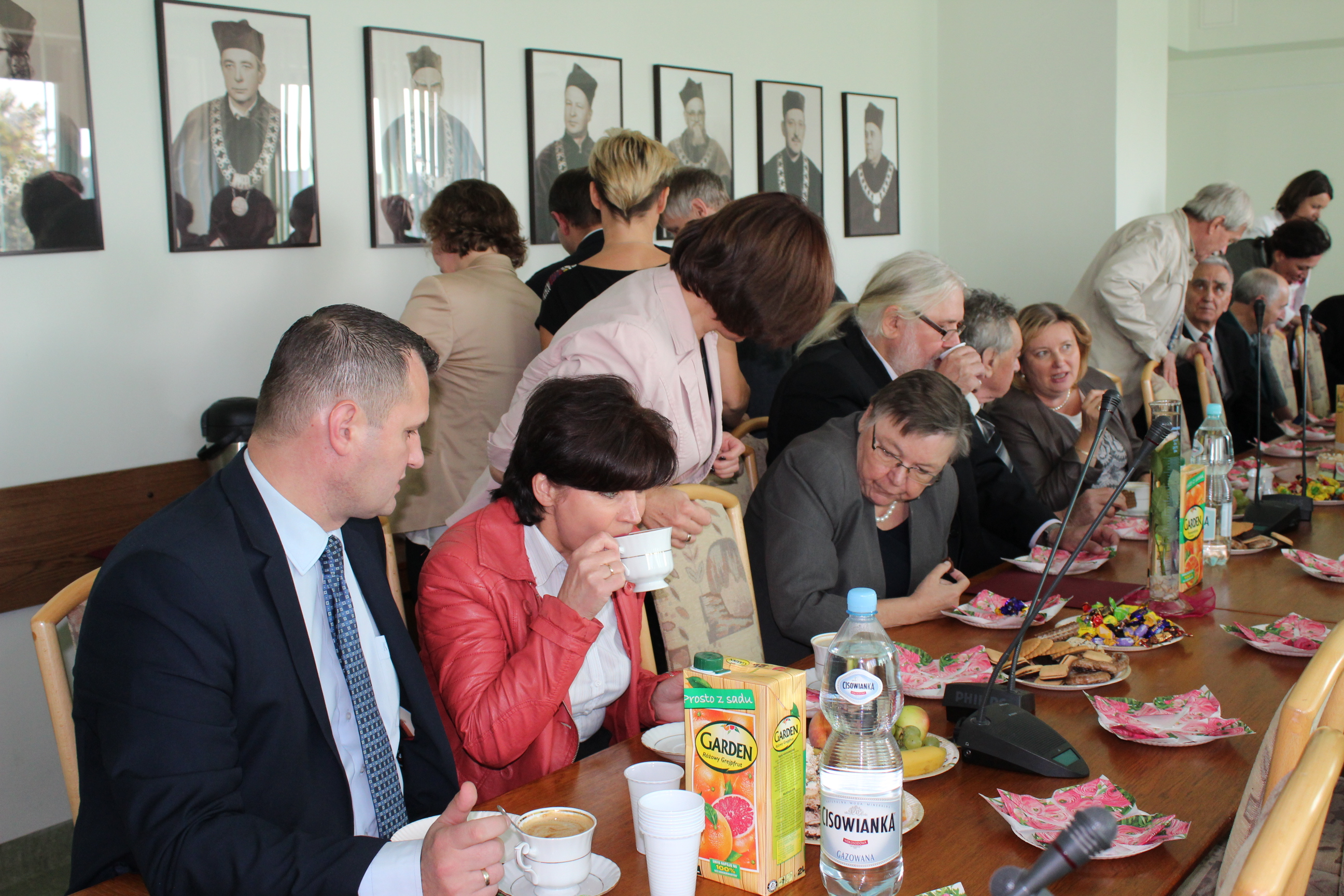 Po uroczystości Pani Dziekan prof. nzw. dr hab. Wiesława Barszczewska zaprosiła wszystkich obecnych na okolicznościowe spotkanie przy ciastku i kawie, gdzie studenci, pracownicy i zaproszeni goście długo prowadzili rozmowy w miłym towarzystwie.